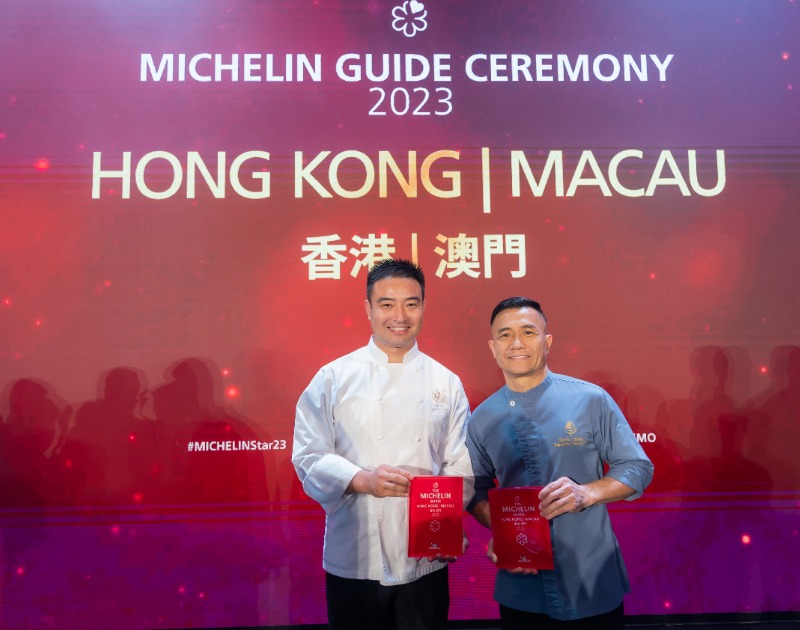 图片说明:澳门伦敦人的淮扬晓宴高级主厨肖飞(左)及澳门四季酒店中餐行政总厨张志才出席《香港澳门米其林指南2023》典礼。